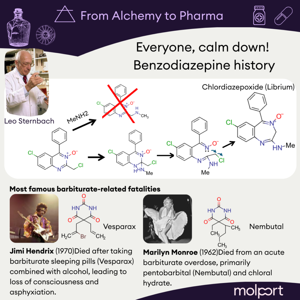 Against this backdrop, Leo Sternbach, a chemist at Hoffmann-La Roche, was tasked with exploring new chemical scaffolds for CNS activity. His work initially focused on a quinazoline-3-oxide–based scaffold, which was considered promising but synthetically challenging. Sternbach aimed to generate a compound array by decorating a halo-substituted core through reactions with multiple amines, an early attempt at systematic SAR exploration. In practice, however, the chemistry proved difficult and unproductive, and the program was eventually set aside.