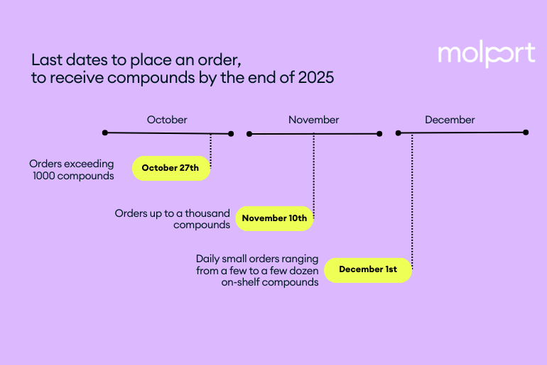 Are you planning to order larger compound sets and have them delivered before the year-end holiday break? Given the increased volume of orders in December, along with busy suppliers and couriers, we highly recommend placing your orders well in advance to ensure timely delivery and avoid any unexpected delays, such as those that may occur in the purchasing department. Please, include enough time build and optimize the list of compounds to be ordered, to negotiate…